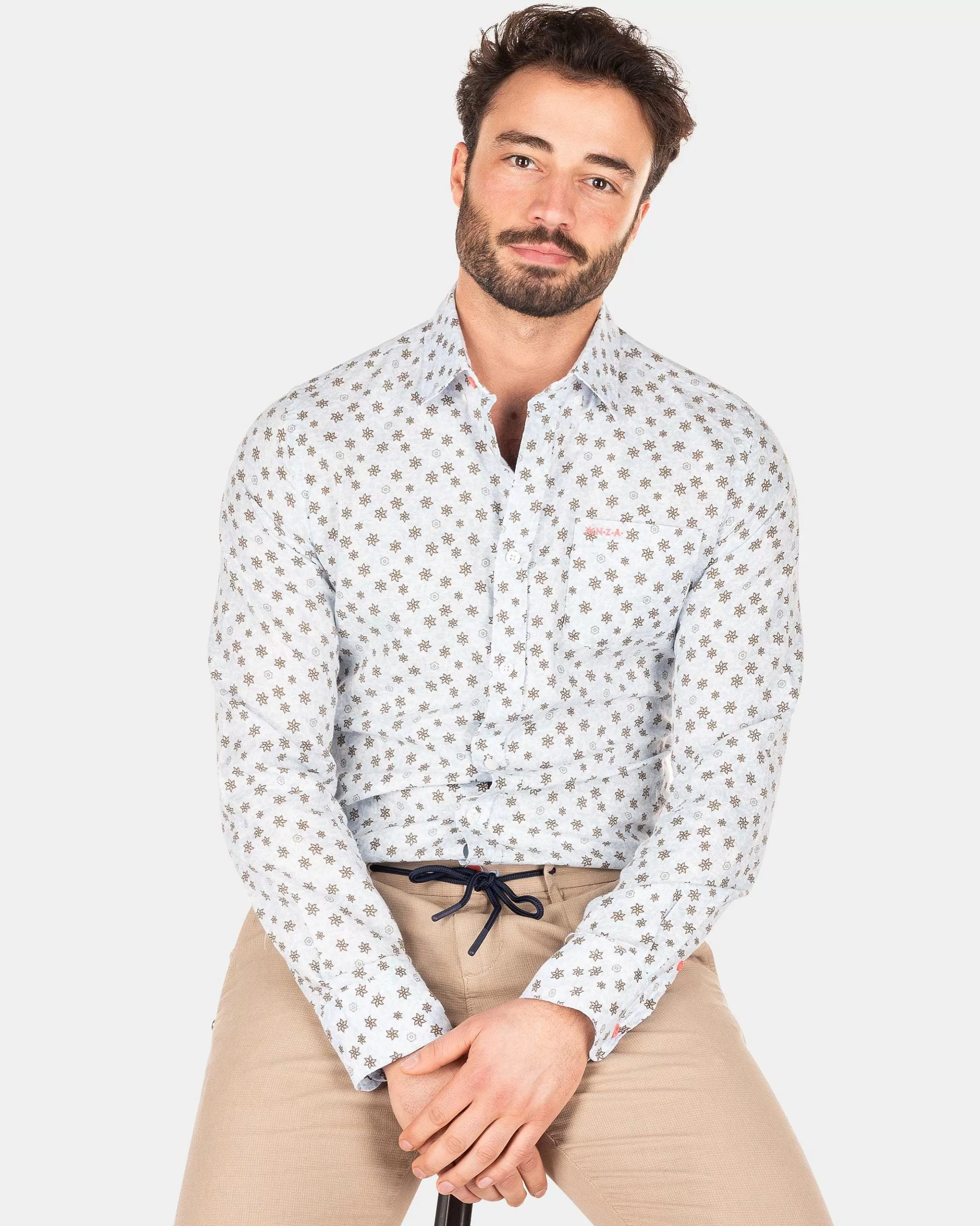 Blaues Hemd Mit Blumendruck – Universal BlueLeinen Ist Der Stoff Nummer Eins, Den Man Im Sommer Tragen Kann. Wenn Es Heiß Ist, Leitet Der Stoff Schweiß Und Wärme An Die Oberfläche, Weg Vom Körper. Und An Diesen Typischen Kühlen Morgen Kann Der Stoff Wärme Speichern Und Sie Angenehm Warm Halten. Der Ohinewai Ist Ein Großartiges Beispiel Für Ein Herrenhemd Aus Leinen In Der Nza New Zealand Auckland Kollektion Dieser Saison. Der Stoff Nummer Eins In Einem Hemd Nummer Eins. Was Kann Man Daran Nicht Lieben?Erhältlich In Universal Blue